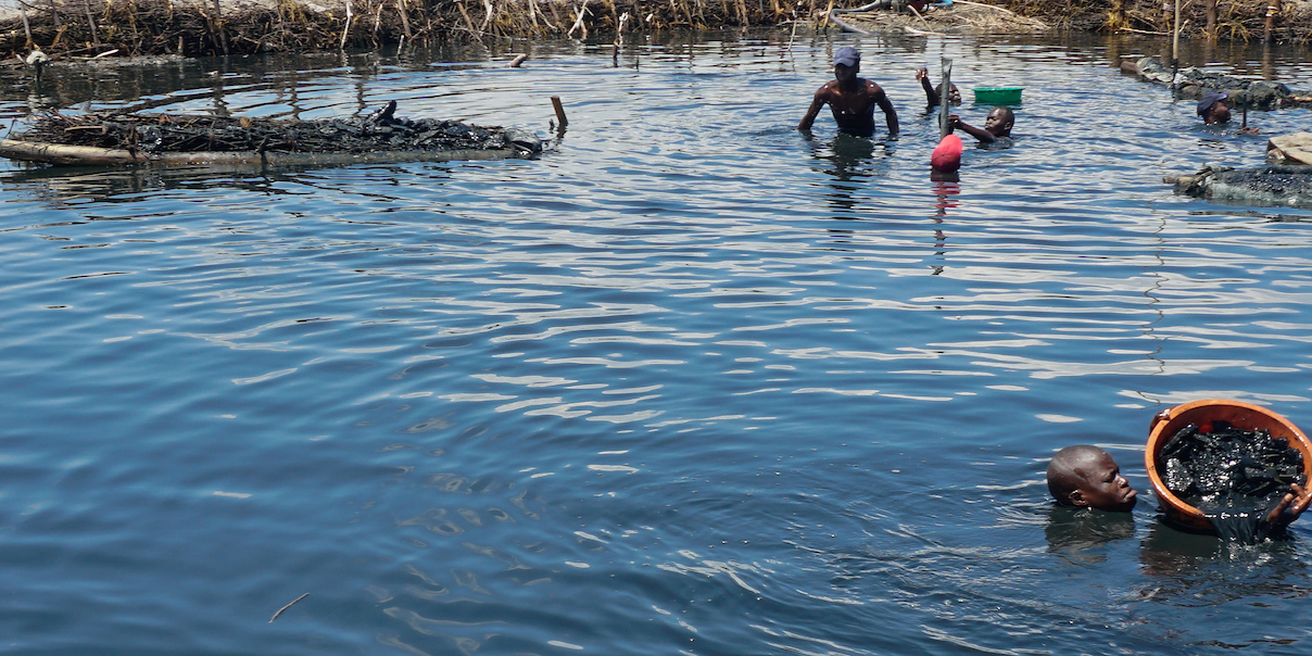 Without proper equipment, miners have mostly continued to rely on improvised protections. While men wear condoms or tie polythene bags around their genitals, female miners wear sanitary pads or smear mixed cassava dough on their genitalia before entering the salty waters.